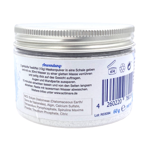 INCI: Solum Diatomeae (Diatomaceous Earth/Terre de Diatomées), Algin, Calcium Sulfate, Tetrasodium Pyrophosphate, Spirulina Maxima Powder, Trisodium Phosphate, Citric Acid